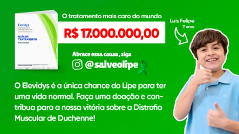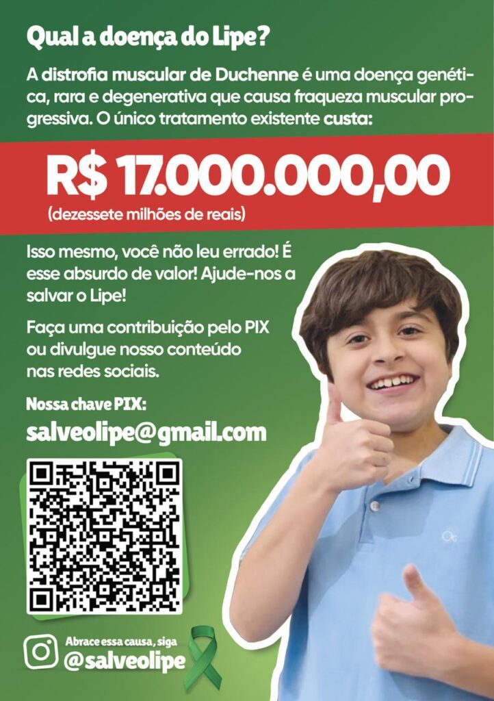 Mas ainda há esperança. Um medicamento chamado Elevidys pode mudar o destino do Lipe. É a única alternativa com potencial de interromper o avanço da doença. Porém, essa esperança tem um preço cruel: R$17.000.000,00 (dezessete milhões de reais). Sim, é um valor inacessível para qualquer família — mas não é impossível se todos nós nos unirmos.