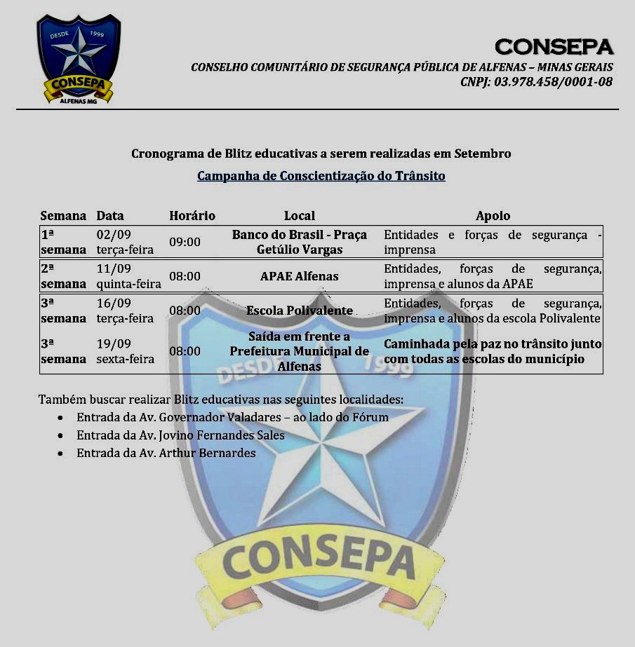 A ação foi organizada pelo CONSEPA – Conselho Comunitário de Segurança Pública de Alfenas, com apoio da Polícia Militar, Corpo de Bombeiros, Ronda Escolar da Guarda Municipal, Tiro de Guerra 04-004 e da Câmara Municipal de Alfenas, que esteve representada por vereadores e equipes.
