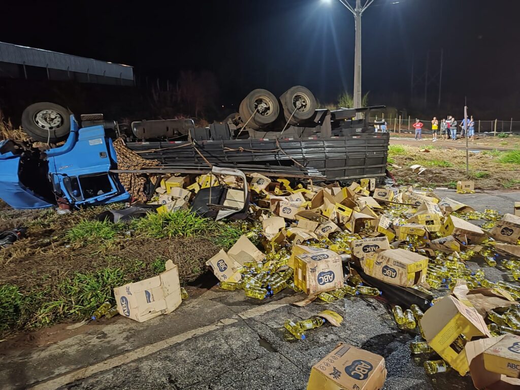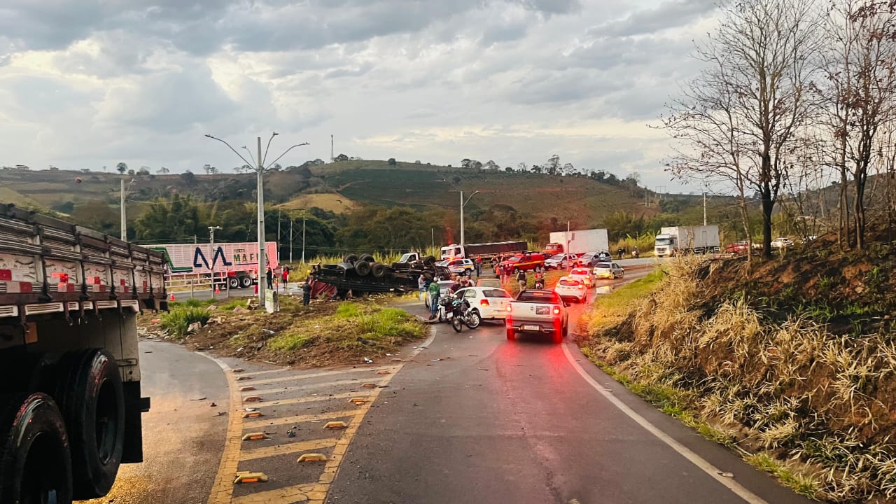Segundo a Polícia Militar Rodoviária (PMRv), o caminhão descia a rodovia aparentemente sem freios quando o motorista tentou manobrar no trevo. Sem controle, o veículo atingiu três automóveis antes de tombar sobre a pista.