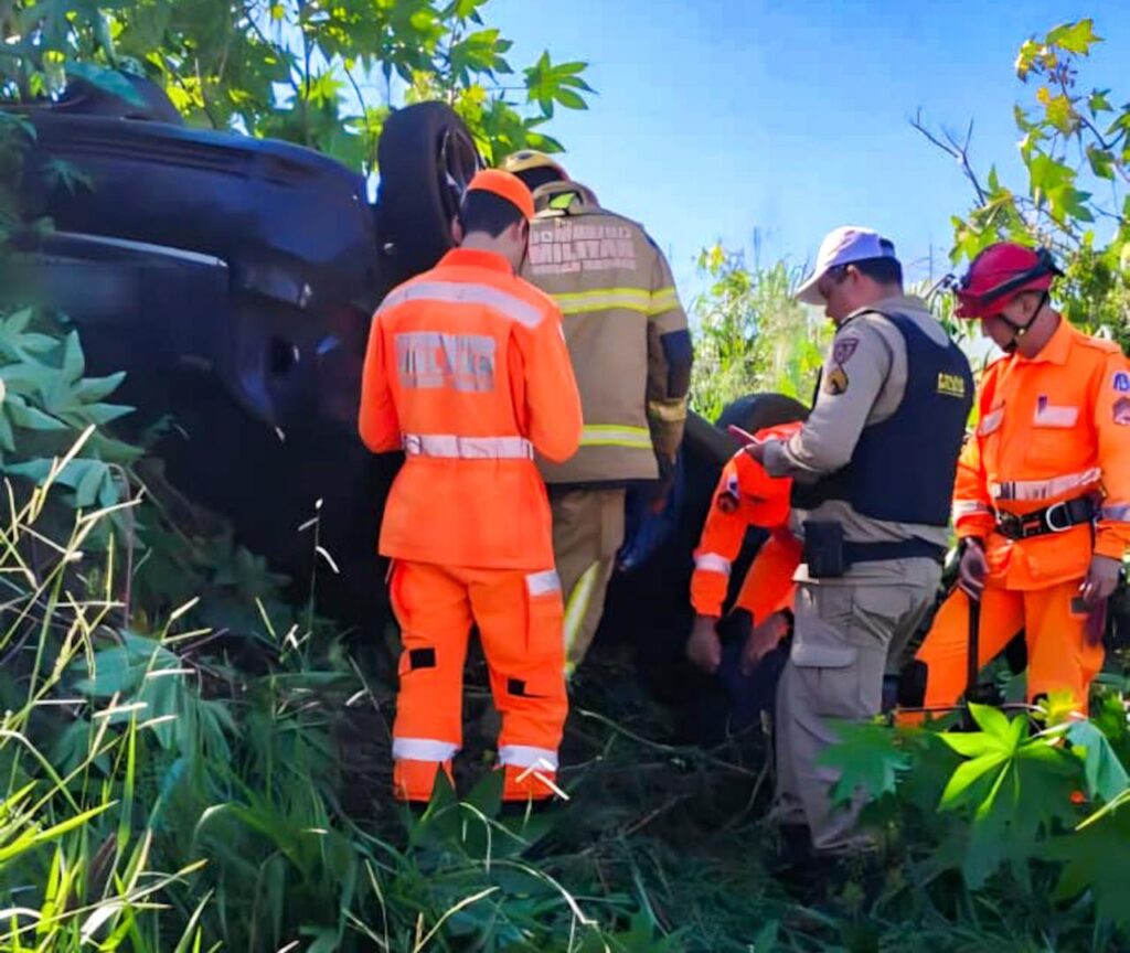 Apesar da gravidade do acidente, a motorista não sofreu ferimentos. Já a passageira, uma jovem de 23 anos, permaneceu no interior do veículo após o capotamento e precisou de atendimento especializado das equipes de resgate.