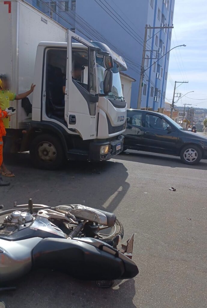 Uma colisão envolvendo um caminhão e uma motocicleta foi registrada na tarde desta quinta-feira (17), no cruzamento da Avenida Afonso Pena com a Rua Sete de Setembro, em Alfenas (MG).