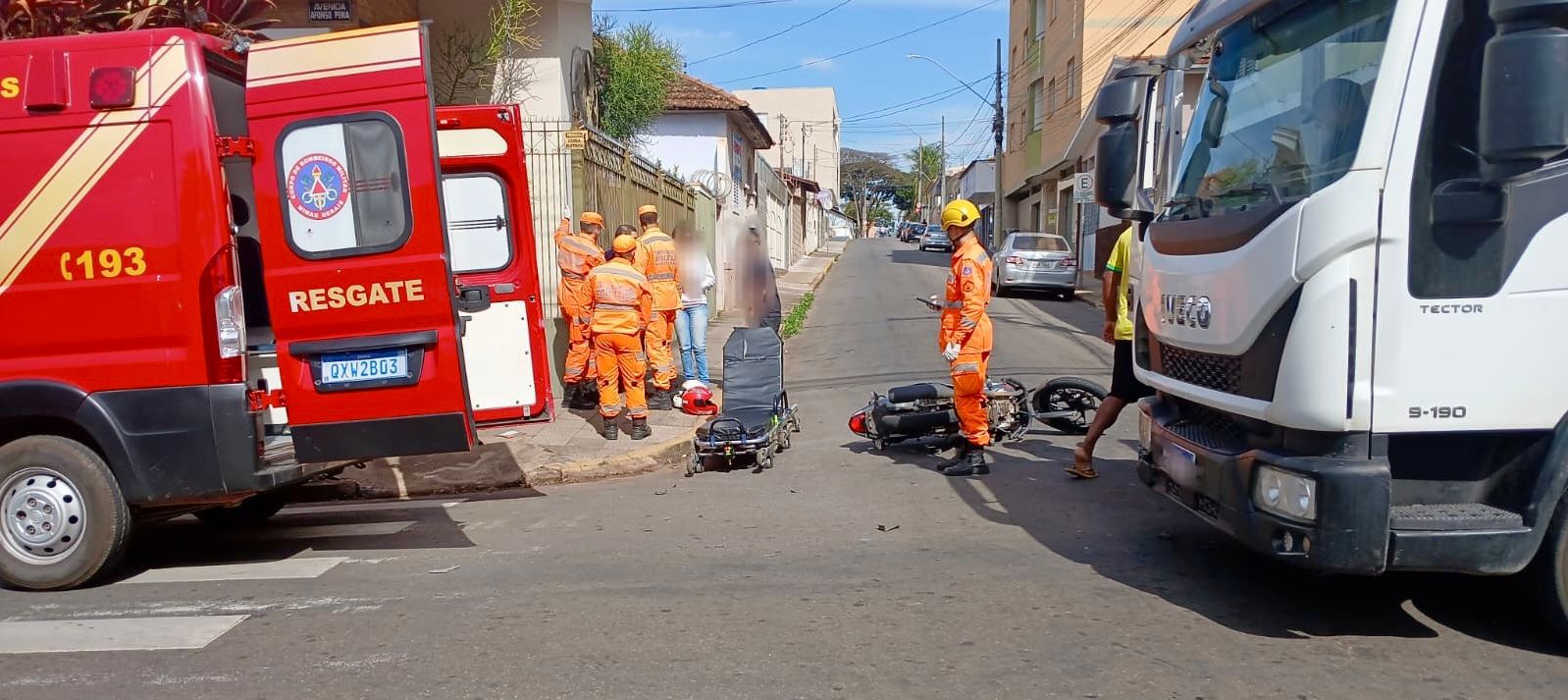 Uma colisão envolvendo um caminhão e uma motocicleta foi registrada na tarde desta quinta-feira (17), no cruzamento da Avenida Afonso Pena com a Rua Sete de Setembro, em Alfenas (MG).