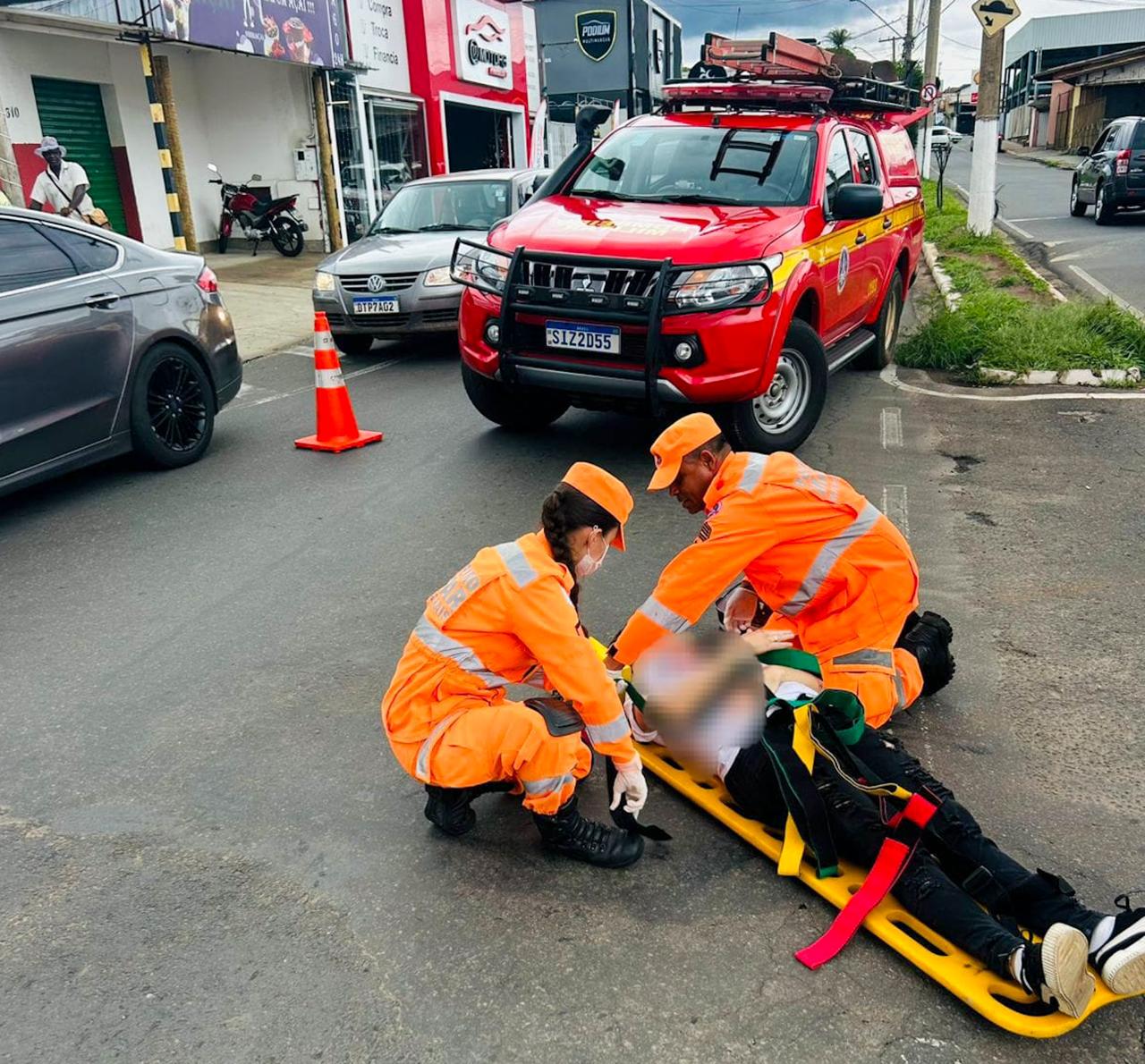 Ao chegarem ao local, os bombeiros encontraram a condutora da motocicleta caída na via, consciente e orientada, apresentando escoriações nos braços e nas pernas, além de um corte superficial na região do queixo. Apesar dos ferimentos, não foram constatadas fraturas aparentes.