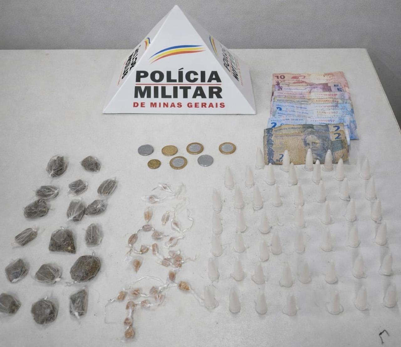 Os militares procederam com a abordagem e, durante a verificação da sacola, localizaram expressiva quantidade de drogas prontas para comercialização. Foram apreendidas 25 pedras de crack, 46 pinos contendo substância análoga à cocaína, 17 buchas de maconha, além da quantia de R$ 61,35 em dinheiro.