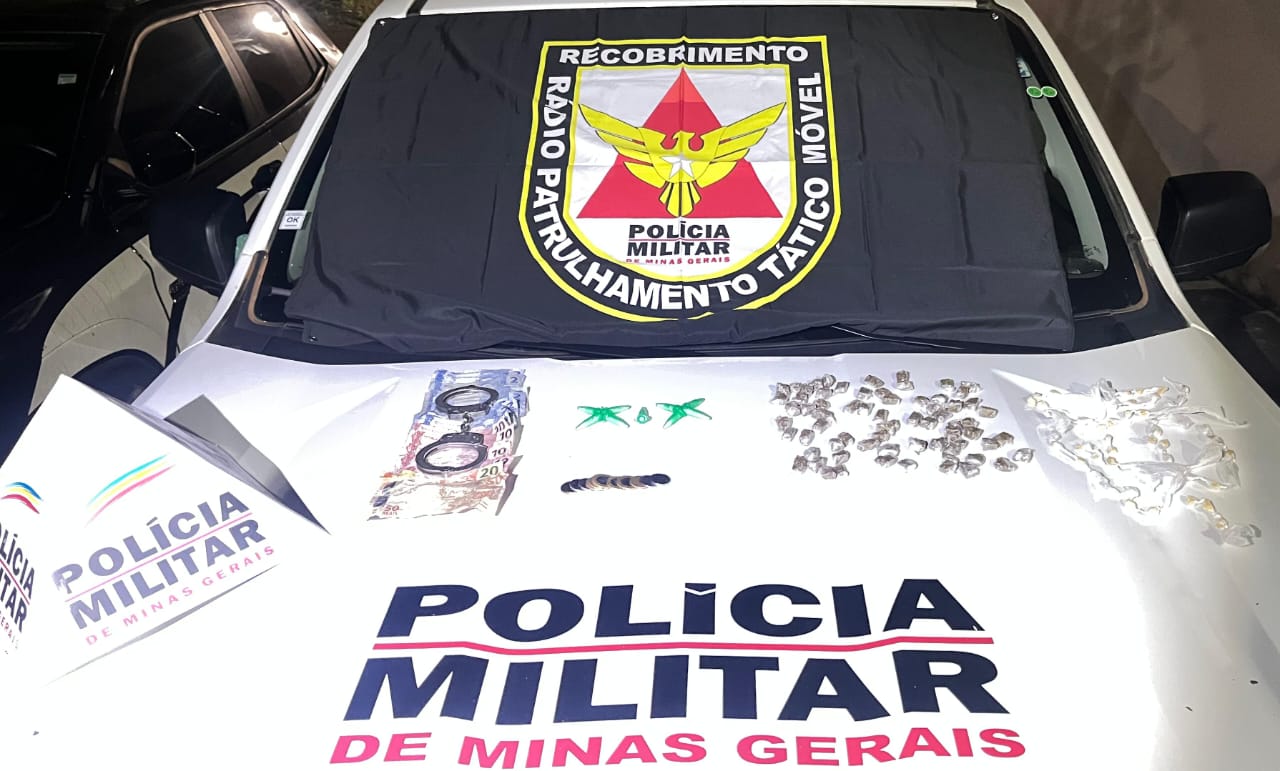 O suspeito, identificado como D.V.M., de 28 anos, foi flagrado no momento em que realizava a comercialização de entorpecentes. Durante a abordagem, os militares encontraram com ele um considerável volume de substâncias ilícitas, incluindo: