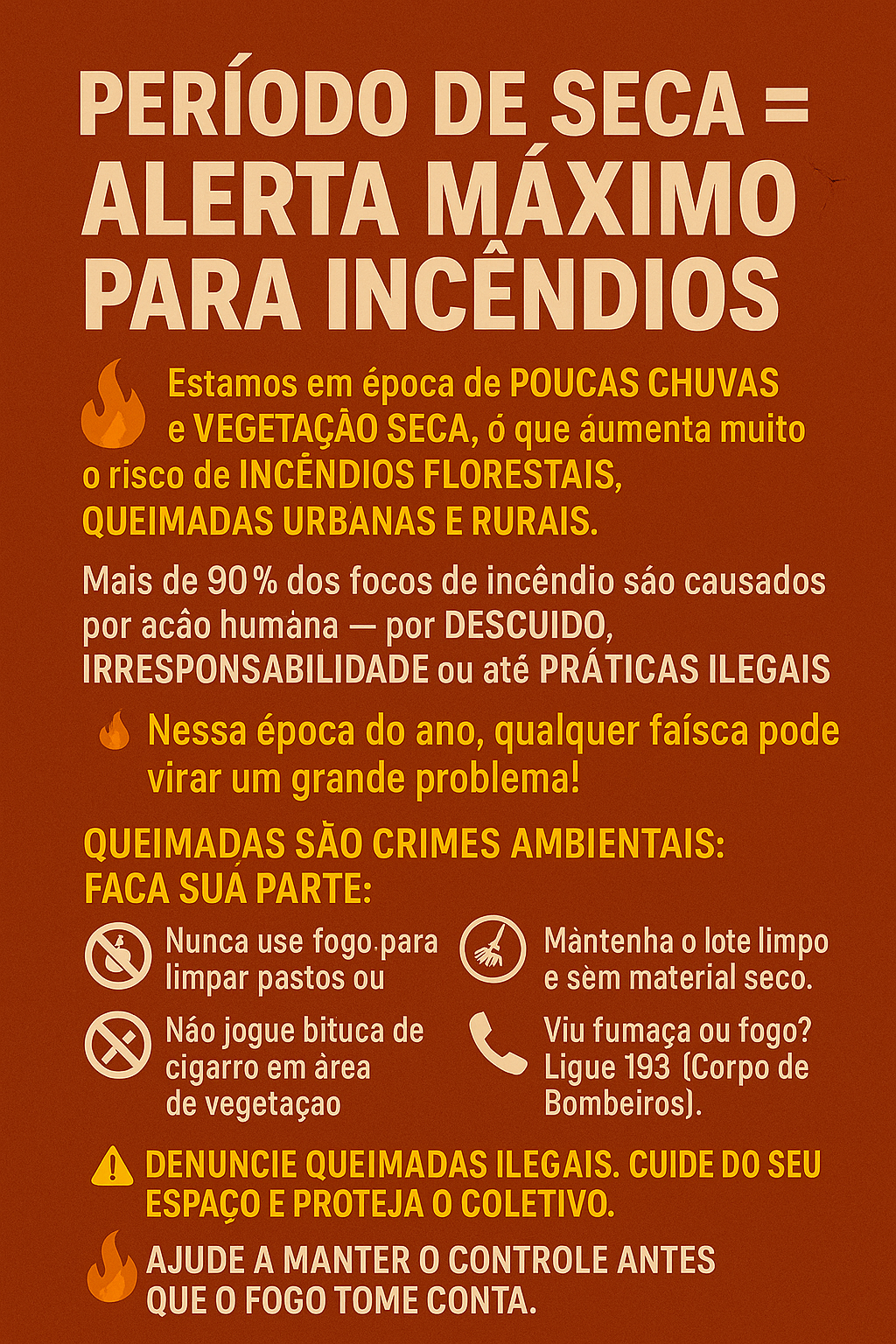 Ao presenciar queimadas, acione imediatamente o Corpo de Bombeiros pelo número 193 ou a Polícia Militar Ambiental. Lembre-se: queimar é crime, e prevenir é responsabilidade de todos.