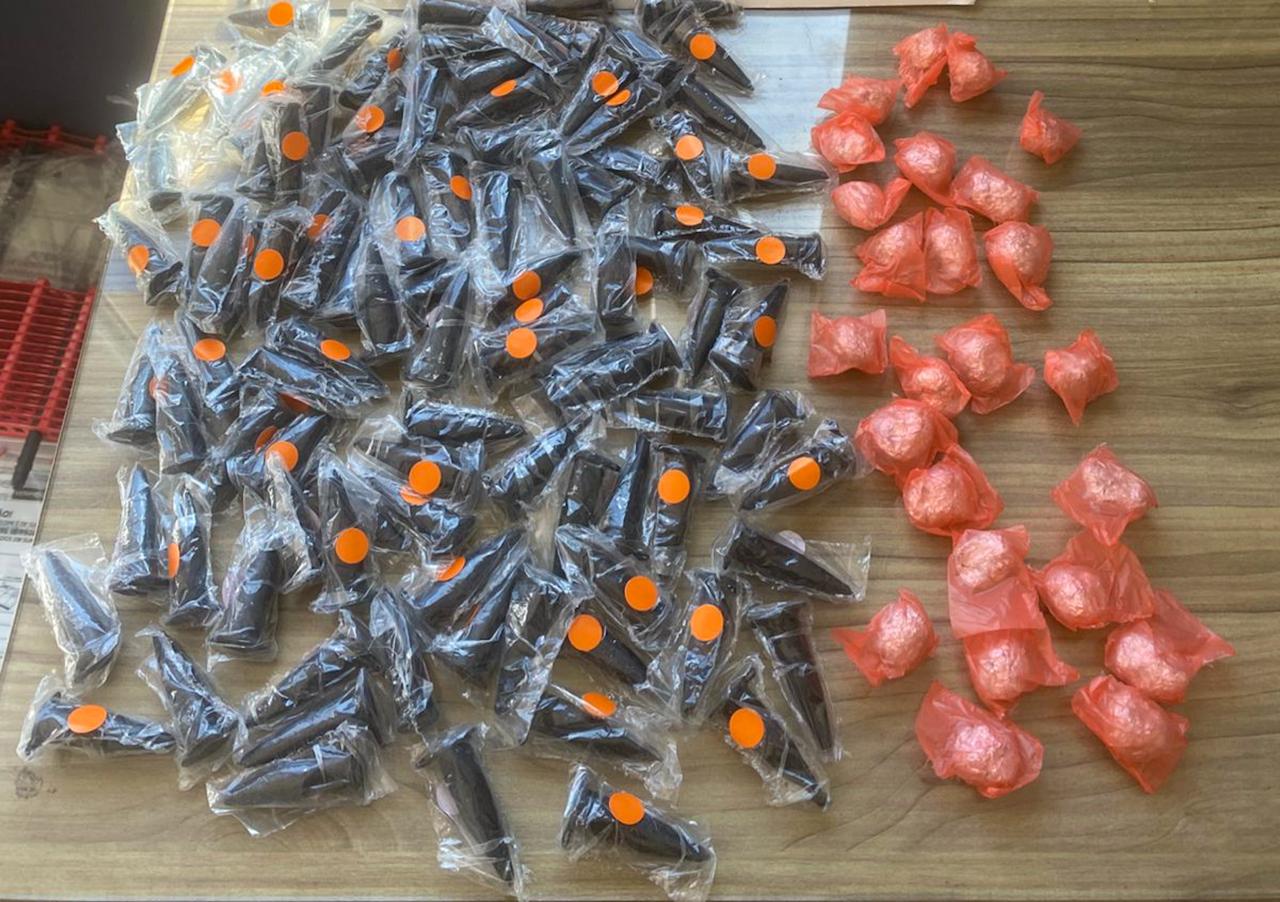 Durante a busca pessoal, os policiais localizaram em posse do menor uma quantidade significativa de drogas, sendo 100 pinos contendo substância análoga à cocaína e 25 pedras de crack, todas já embaladas e prontas para a comercialização, o que reforça a caracterização do tráfico ilícito de entorpecentes.