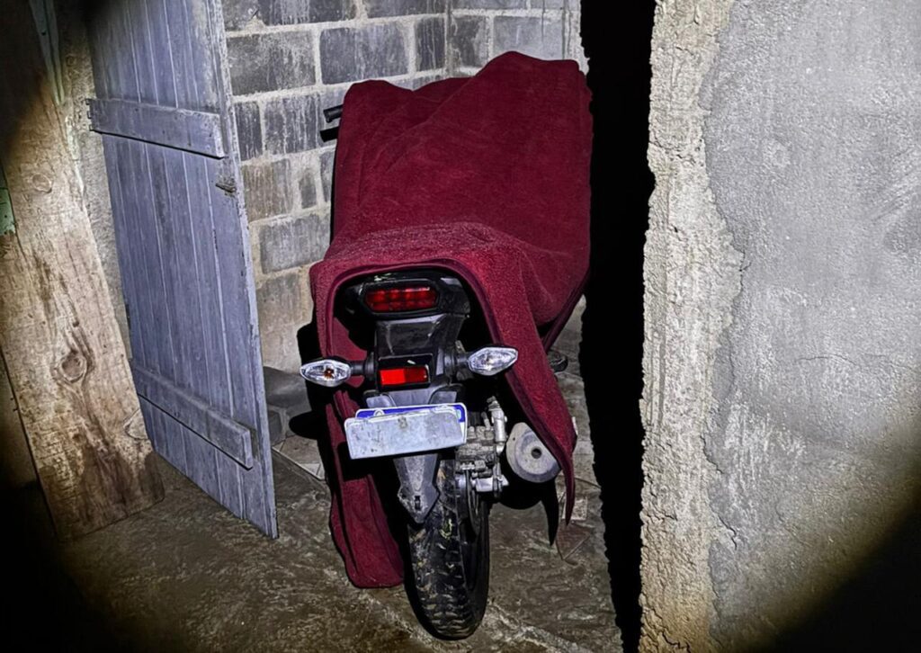Em uma das residências abandonadas, os policiais localizaram uma motocicleta Honda CG Titan, de cor vermelha, que havia sido furtada no dia 06 de março de 2026, no bairro Bom Jesus.