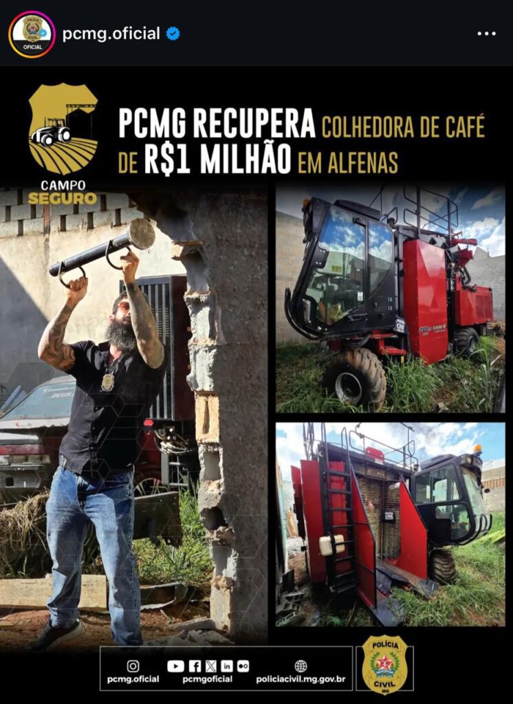 Em Alfenas-MG a Polícia Civil recuperou uma colhedora de café avaliada em 1 milhão de reais.