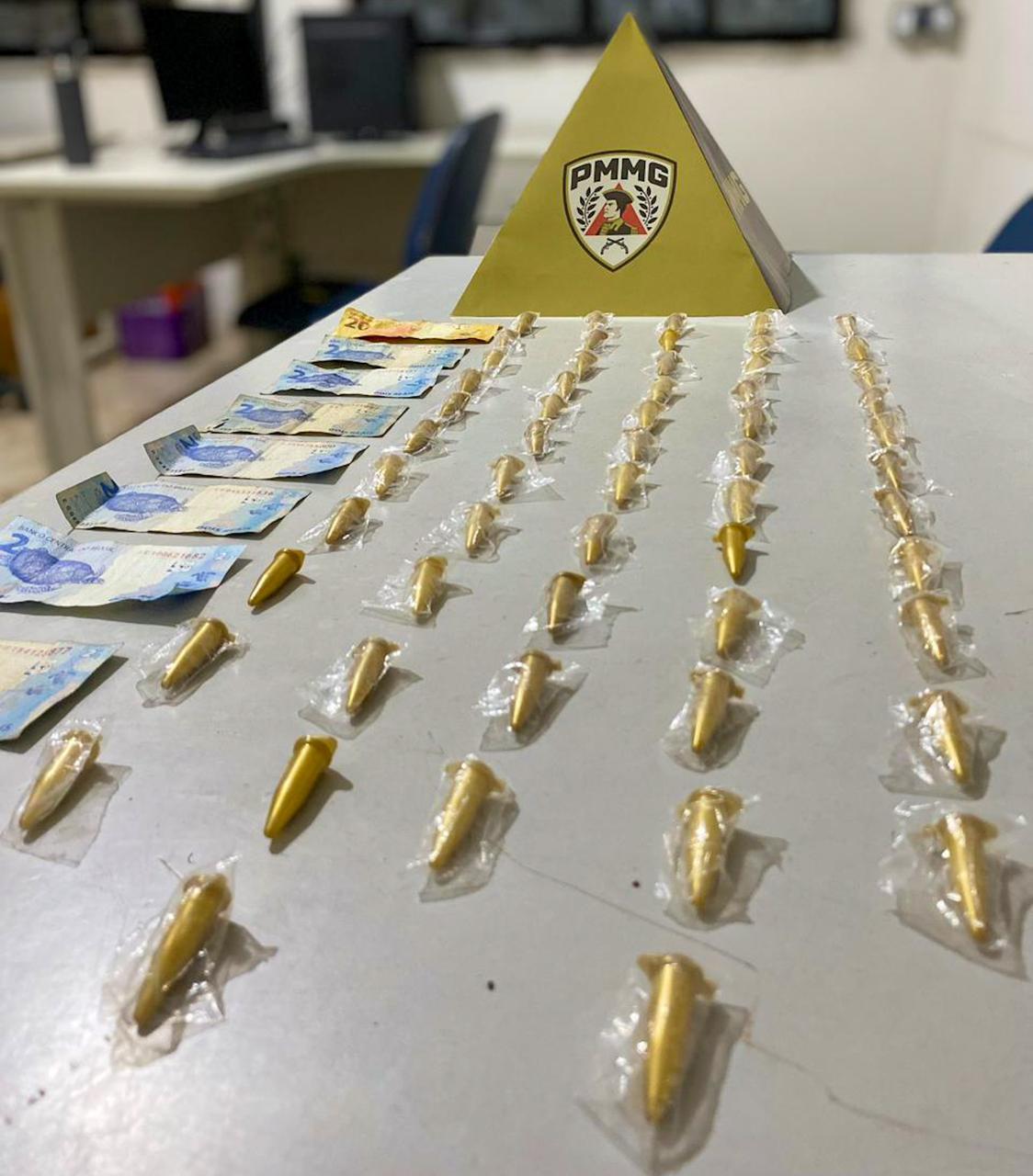 No interior da sacola, os militares encontraram 57 pinos contendo substância análoga à cocaína, além da quantia de R$ 36,00 (trinta e seis reais) em notas diversas, valor comumente associado à comercialização de entorpecentes em pequena escala.