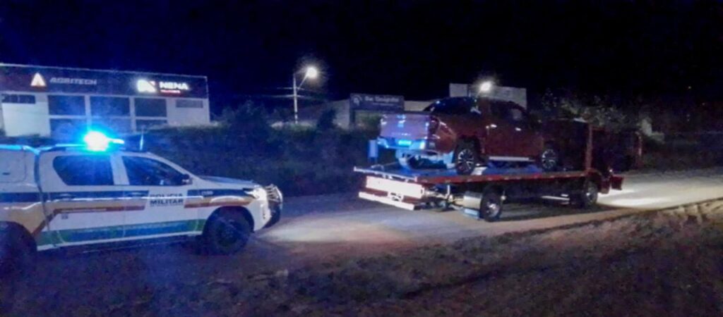 Após consulta ao sistema informatizado, foi confirmado que o veículo havia sido roubado no dia anterior (16/03), no município de Espírito Santo do Dourado. Na ocasião, indivíduos armados renderam uma família e subtraíram veículos da propriedade rural, em uma ação criminosa marcada pela violência e grave ameaça.