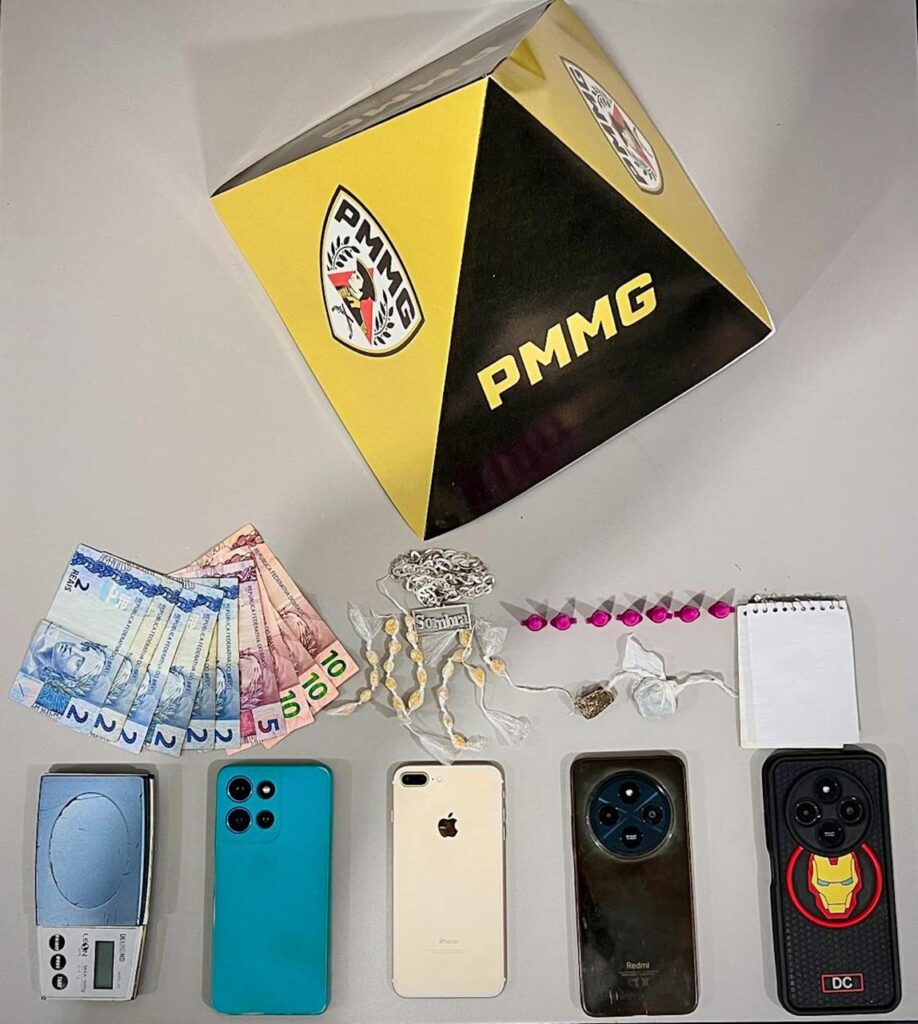 Durante as buscas, os policiais localizaram porções de crack e maconha, além de pinos de cocaína, uma balança digital de precisão e um caderno com anotações do tráfico, reforçando as evidências de organização e continuidade da atividade ilegal.