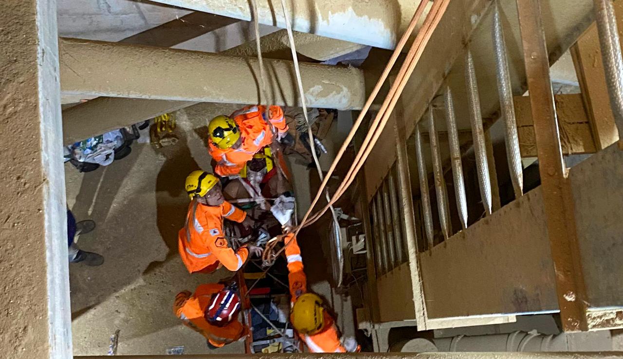 Em seguida, a vítima foi cuidadosamente acondicionada em uma maca do tipo Sked. Para a retirada vertical, os bombeiros utilizaram um sistema de redução de força com polias e cordas, técnica que garantiu uma elevação controlada e segura até a superfície.