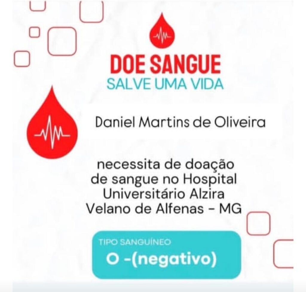 Amigos e amigas, estamos fazendo um apelo solidário em nome de Daniel Martins de Oliveira, que precisa urgentemente de doações de sangue tipo O- (O negativo).